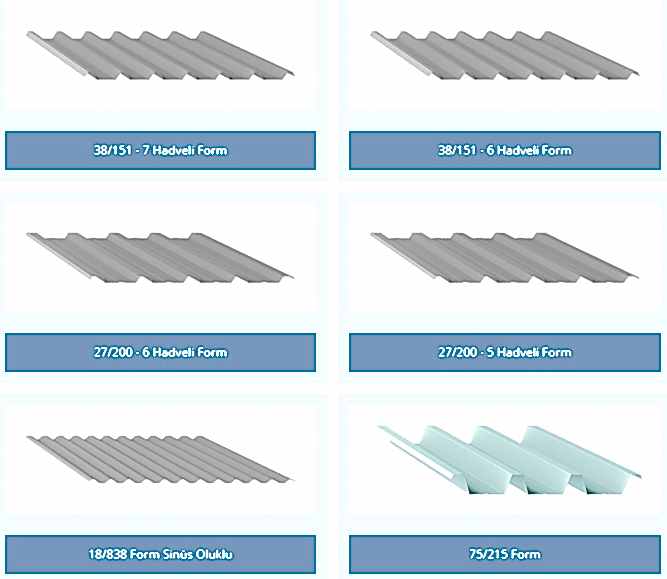 - Trapez çatı levhaları boyalı galvaniz saç, boyasız galvanizli saç üretimlerin yanında, boyalı alüminyum olarakt a üretilebilmektedir.